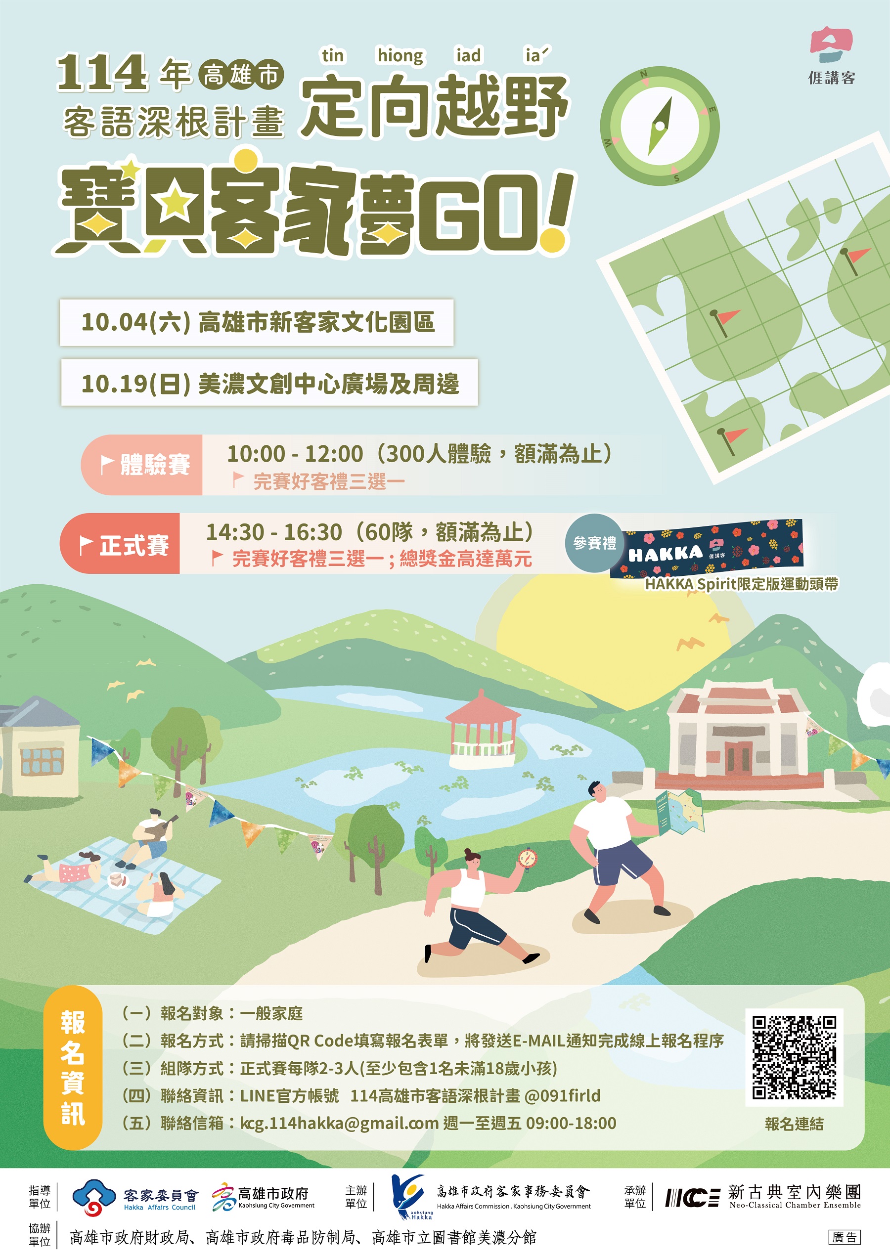 高雄市客語深根服務計畫已邁入第4年,透過辦理客語認證班、職場及社區客語班、客話講故事、客語師資培訓等多元化課程,提升客語在家庭、社區及公共領域的使用頻率,營造高雄友善客語環境及扎根客語傳承。今年首度將語言學習融入「定向越野」,邀請親子組隊挑戰六大客語任務,在跑動、解謎與闖關過程中,把客語用得又酷又自然,還能進一步認識客家文化。體驗賽名額300人,完成即可獲得「好客禮三選一」;正式賽則限額60隊,總獎金高達萬元,並贈送限量「HAKKA Spirit」運動頭帶,讓挑戰充滿榮耀與紀念價值。