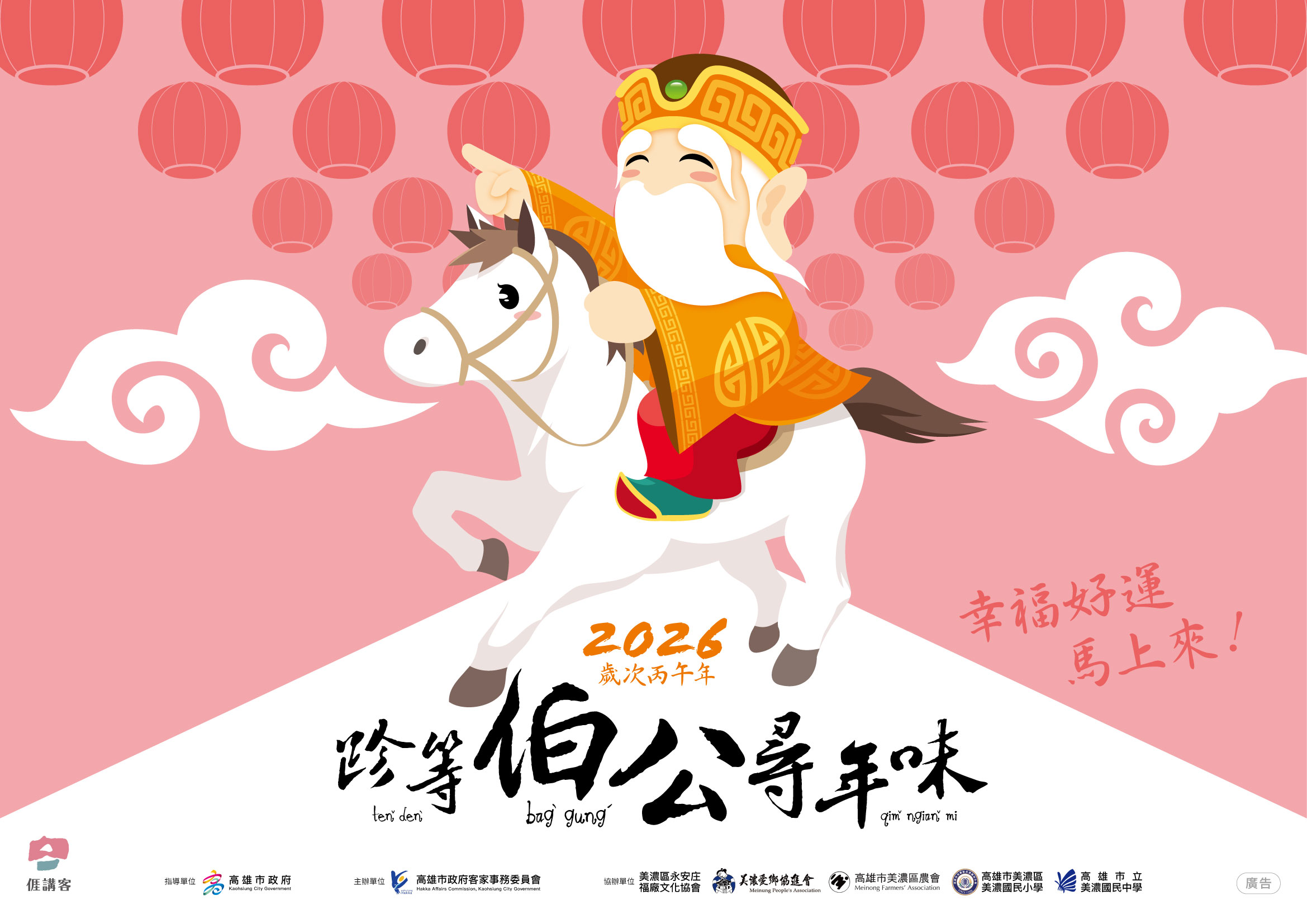過年不只在家團圓,也能帶著孩子走進客庄,在玩樂中認識文化、迎接好運。高雄市政府客家事務委員會將於115年2月14日(星期六)下午,在美濃文創中心廣場舉辦「2026跈等伯公尋年味」活動,結合傳統客庄年節文化、手作體驗、互動遊戲與在地小市集,邀請民眾攜家帶眷走進美濃,在熱鬧歡喜的年節氛圍中,認識客庄文化、感受伯公信仰的祝福,一起迎接嶄新的一年。