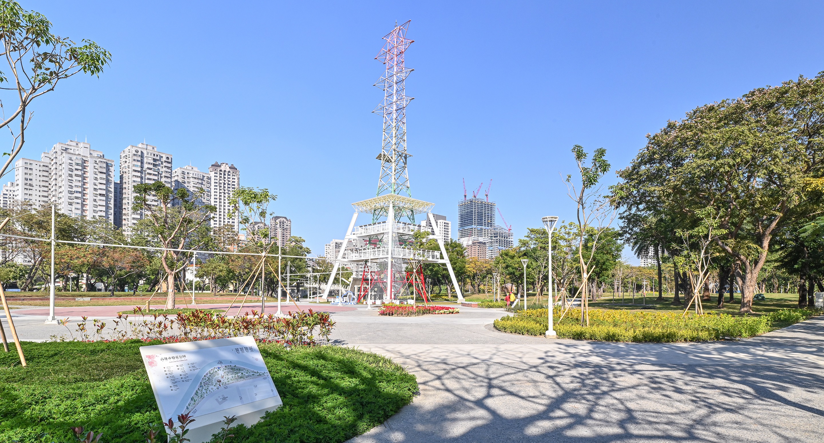 園區特別保留了原有的綠地生態,同時融入客家五花九香、民俗植物等特色植栽,並將客家文化融入景觀美學,讓文化語彙與自然生態兼具,成為居民生活中的情感座標、在地城市的文化節點。其中,公園內具象徵性的地標「光之塔」,象徵城市中不滅的文化之光,也見證了工業遺構轉化為社區記憶載體的可能。
